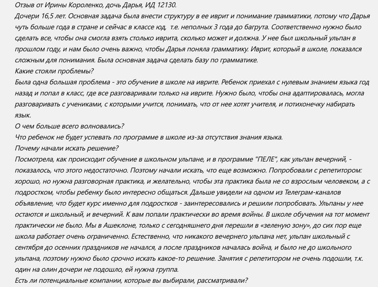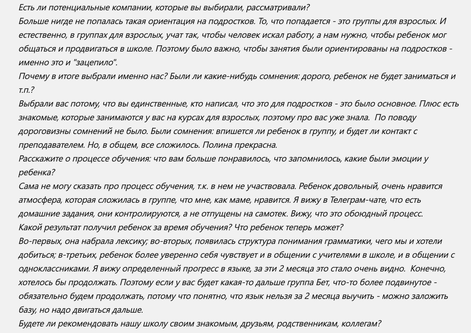«В основе методики не прохождение грамматики и заучивание слов, а понимание структуры языка. Эта методика дала впечатляющие результаты.»