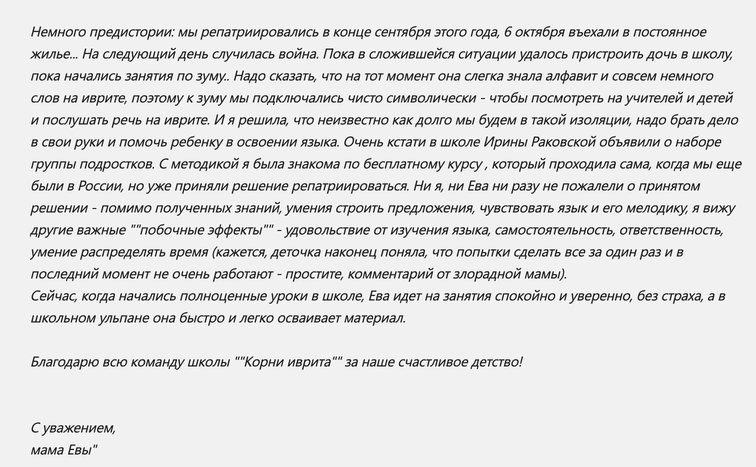 «Методика является столь эффективной, что позволяет новым репатриантам в короткий срок свободно овладеть ивритом»